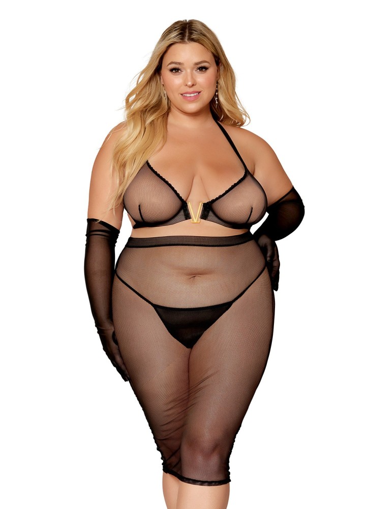 Ensemble lingerie sexy, spécial grande taille, composé de deux pièces sexy avec soutien-gorge et jupe en résille noire de chez votre distributeur Dreamgirl, vente en dropshipping de lingerie sexy.