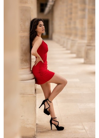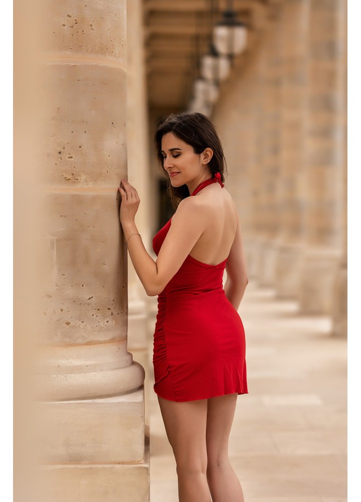 Robe courte rouge avec large décollecté et lanières croisées sur la poitrine. Dos nu de la collection Aurora de la marque de robes sexy Be lily