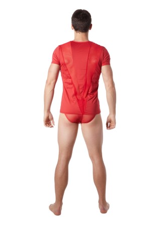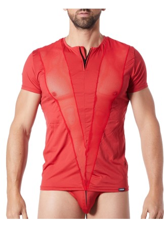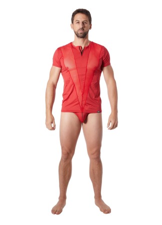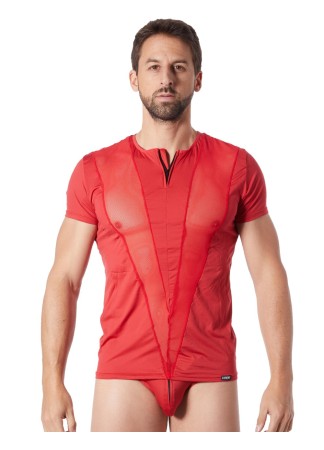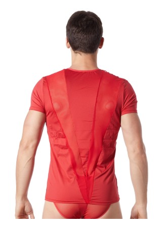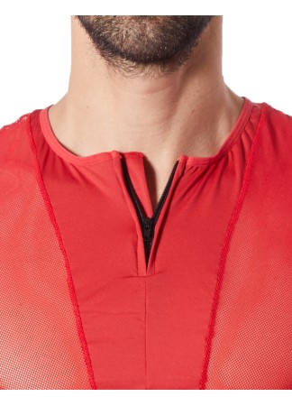 Avec ce t-shirt rouge vous serez à la pointe de la mode. Vous le porterez en sous-vêtements comme en vêtements car il s'accomodera parfaitement avec un jean fashion. Un t-shirt rouge sexy très agréable sur la peau avec une touche de séduction grâce à ses bandes en V de fine résille rouge qui forment, devant comme derrière, un V. Son col est rond et est muni d'un zip.